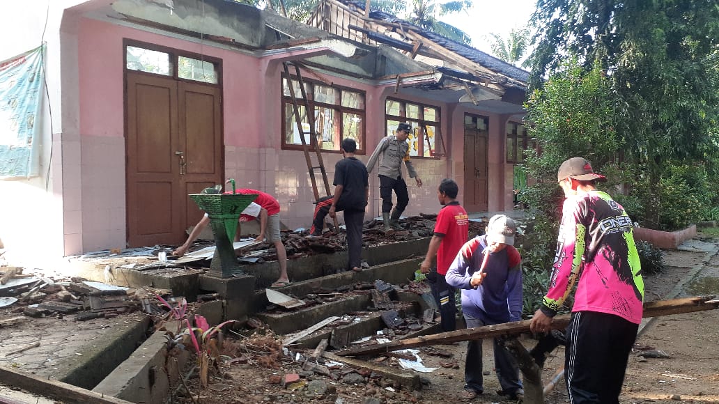 TRENGGALEK, IPers– Sejumlah petugas kepolisian bersama warga desa Bendoroto Kecamatan Munjungan melakukan kerja bakti membersihkan puing-puing material bangunan SMP Negeri 3 Munjungan yang ambruk.