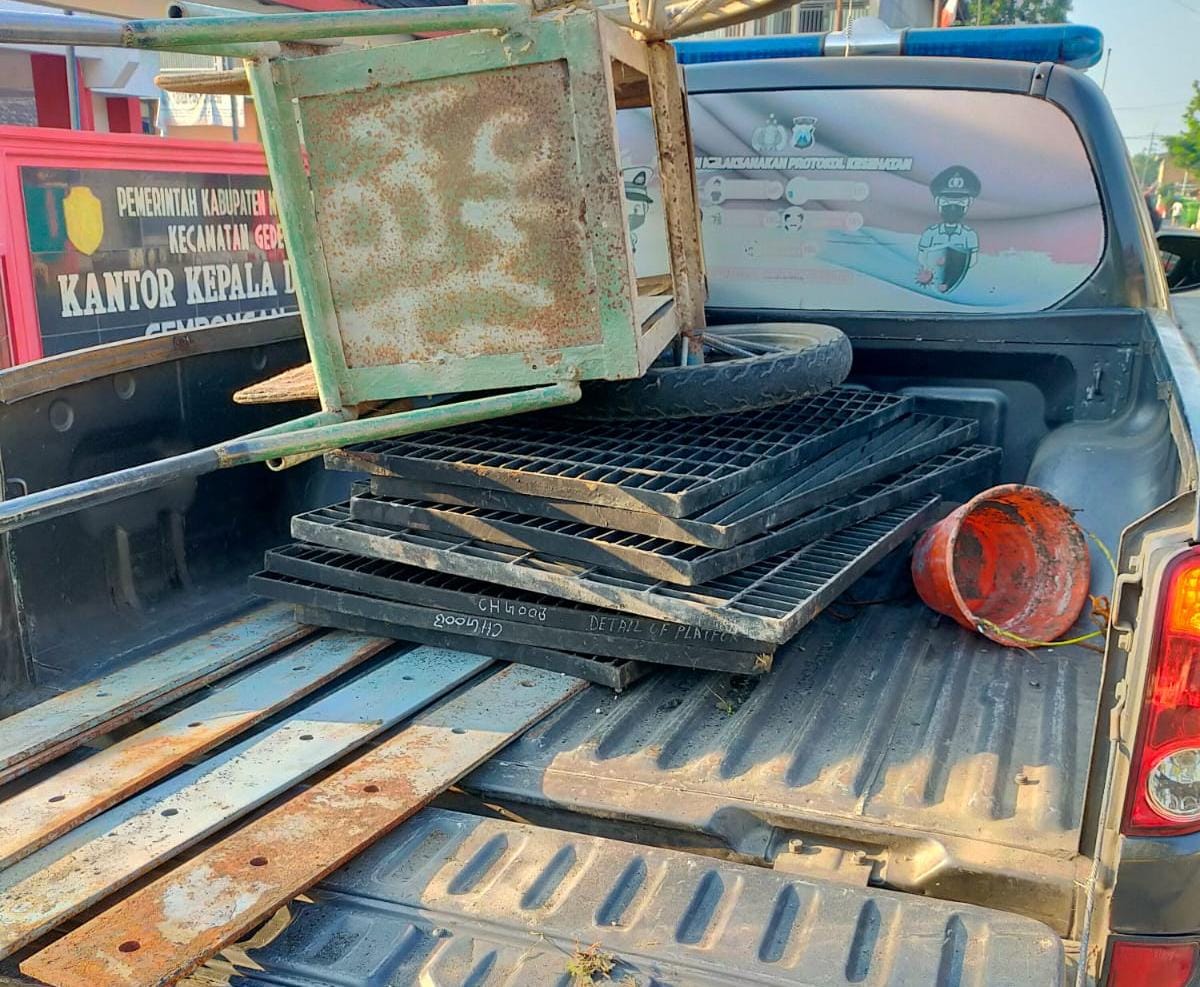 Kasi Humas Polresta Mojokerto menyebutkan bahwa barang bukti yang berhasil diamankan oleh prtugas meliputi lima buah besi plat setebal 1 sentimeter berukuran 3x5 meter, sembilan besi ram ukuran 2x1,5 meter, 1 unit motor Suzuki Shogun warna biru dengan nopol L 6022 TFD yang dipakai untuk melakukan aksi pencurian, serta satu buah gerobak pasir dan kayu.