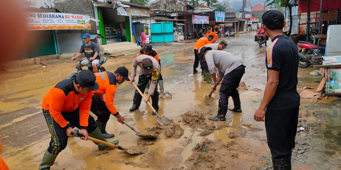 Beberapa pesonel terlihat memotong pohon yang berada di tengah jalan karena terbawa arus banjir. Sementara yang lainnya nampak mengeruk lumpur menggunakan sekop, cankul ataupun peralatan lainnya.