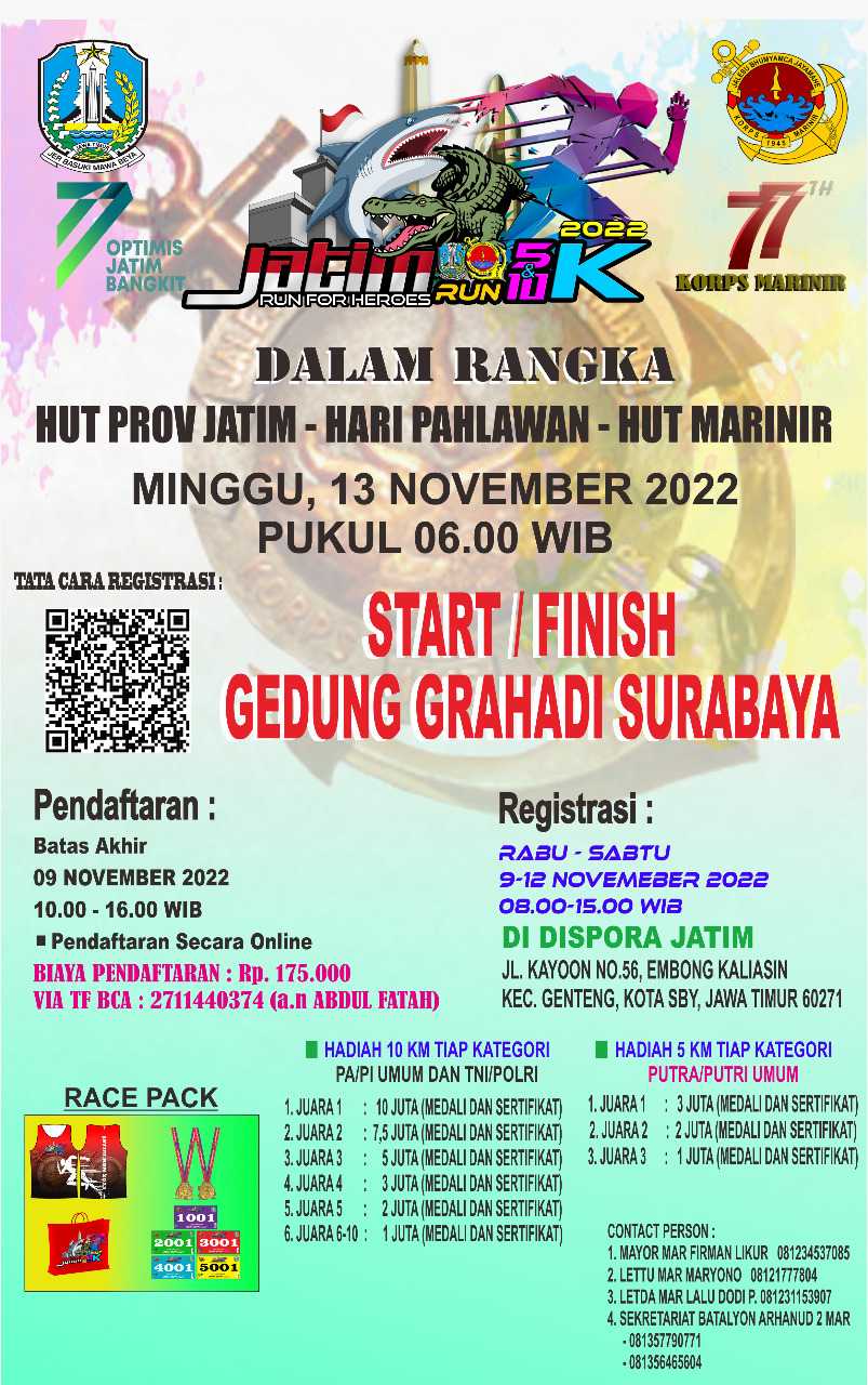 SURABAYA, IPers - Dalam rangka memperingati HUT Provinsi Jawa Timur ke-77, Hari Pahlawan, dan HUT Korps Marinir ke-77, Korps Marinir TNI AL mengandeng Pemerintah Kota Surabaya dan Dinas Kepemudaan dan Olahraga Provinsi Jawa Timur (Dispora Jatim) guna menggelar Lomba Lari bertema Jatim Run 2022, Run For Heroes pada Minggu, 13 Nopember 2022.