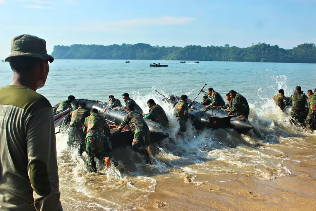 Malang, IPers - TNI AL, Dispen Kormar (Malang). Guna melatih ketangkasan dalam menghadapi bahaya serangan udara musuh, Prajurit Rakca Bhuana Cakti Batalyon Arhanud 2 Marinir melaksanakan problem tahap laut materi Dayung dan Eksersisi Perahu Karet yang tergabung dalam rangkaian kegiatan Latihan Pemantapan Yonif DPK (Dengan Perkuatan Kesenjataan) yang dilaksanakan di Pantai Tamban, Kec. Sumbermanjing Wetan, Malang. Minggu (20/11/2022)