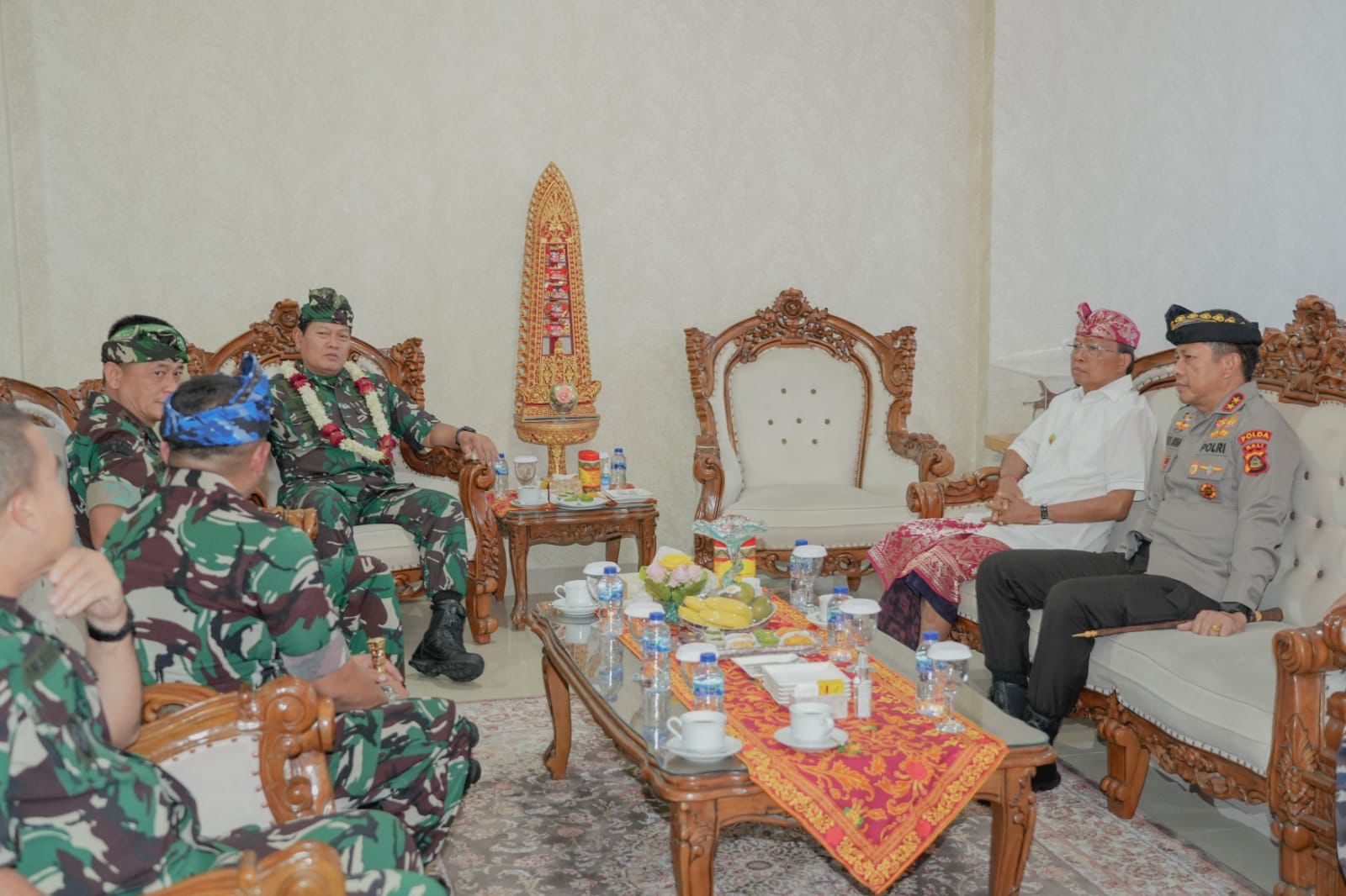 BALI, IPres - Kapolda Bali Irjen. Pol. Drs. I Putu Jayan Danu, S.H., M.Si. menyambut kedatangan Panglima TNI Jenderal TNI Yudo Margono di Base Ops Bandara I Gusti Ngurah Rai dalam rangka kunjungan kerja di provinsi Bali, Selasa (21-2-2023)