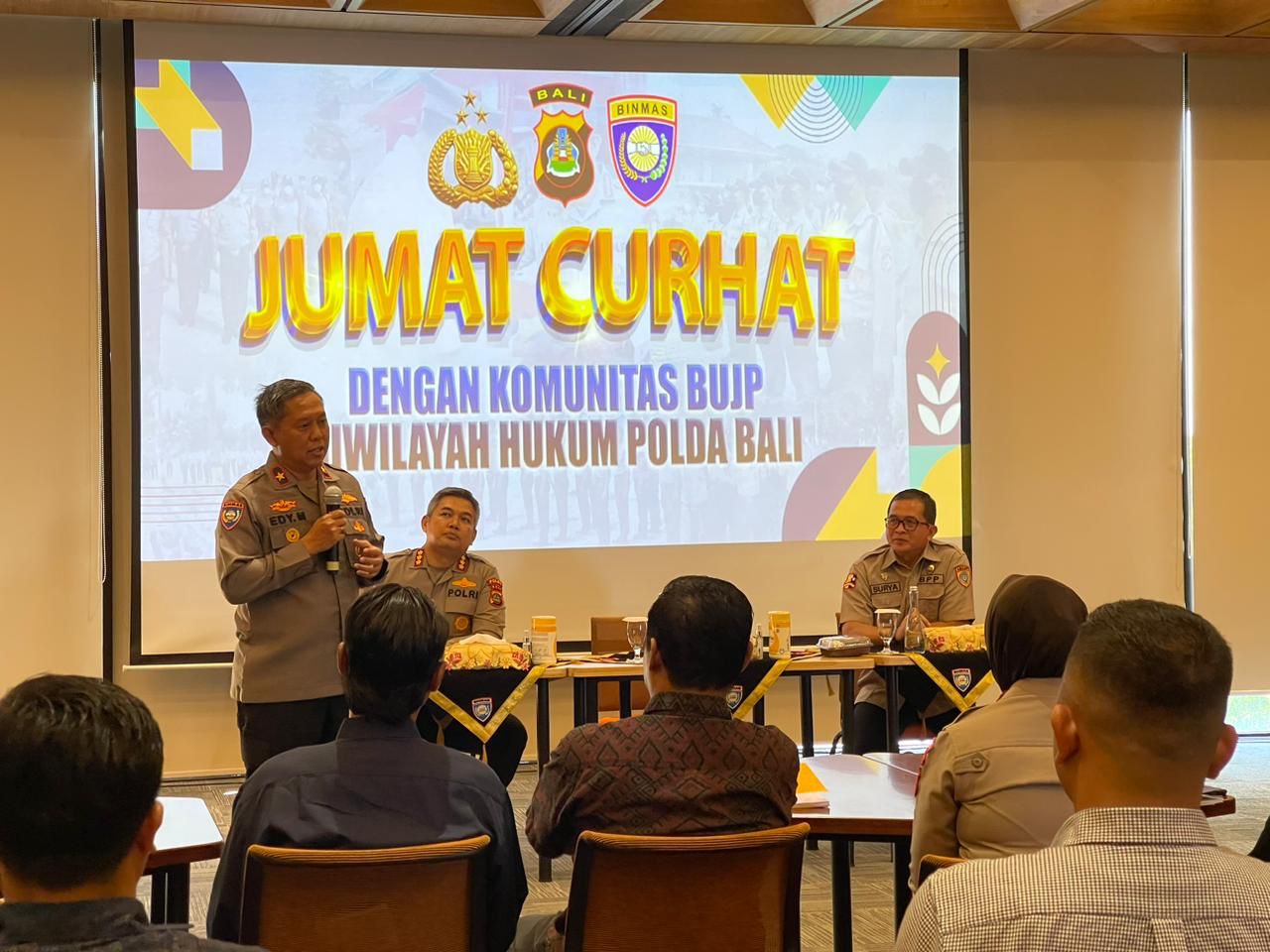 Kegiatan Jumat Curhat ini turut dihadiri oleh Dir Binpotmas Korbinmas Baharkam Polri, Brigjen Pol. Edy Murbowo S.I.K., M.Si. dan Pejabat Utama (PJU) Polda Bali.