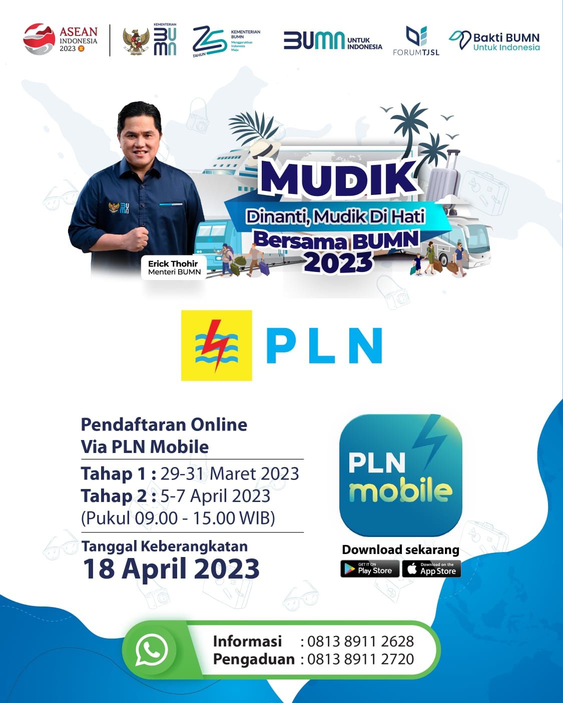 Jakarta, IPers - 29 Maret 2023. Menjelang Hari Raya Idul Fitri 1444 Hijriah, PT PLN (Persero) bersama dengan Kementerian Badan Usaha Milik Negara (BUMN) menggelar kegiatan Mudik Gratis. Mengambil tajuk 'Mudik Dinanti, Mudik di Hati Bersama BUMN 2023', PLN mengajak segenap pelanggan yang berminat untuk segera mendaftar.