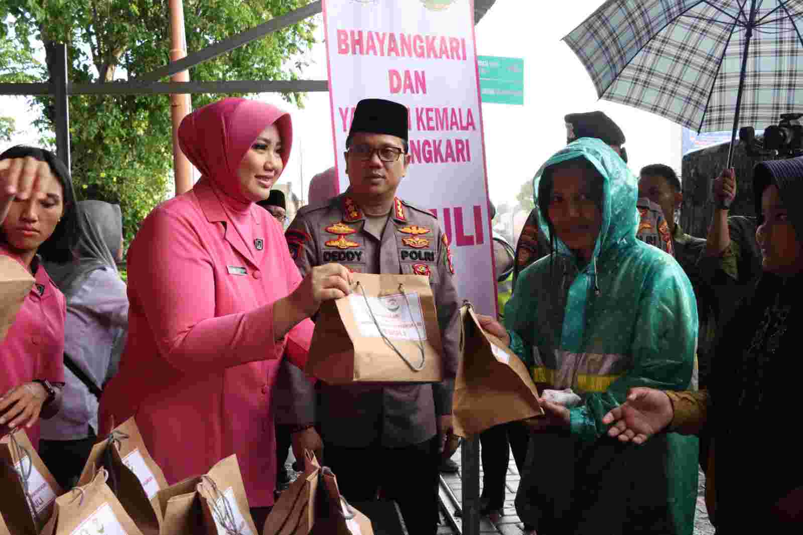 Banyuwangi, IPers – Hujan tidak mengurungkan niat Kapolresta Banyuwangi, Kombespol Deddy Foury Millewa bersama Ketua Bhayangkari Banyuwangi, Reny Deddy Millewa berbagi 1000 takjil di depan Masjid Baiturrahman Banyuwangi.