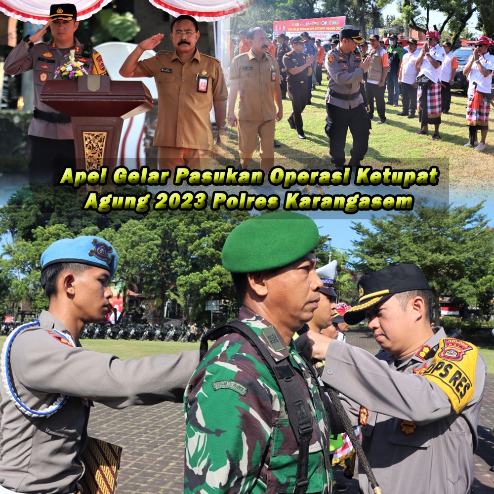 Kapolres Karangasem membacakan amanat Kapolri Jenderal Polisi Drs. Listyo Sigit Prabowo, M.Si. yang dibacakan Kapolres Karangasem yang pada intinya menyampaikan “Hari ini Apel gelar pasukan operasi ketupat 2023 dilaksanakan secara sentak diseluruh Indonesia mulai dari Mabes polri hingga satuan kewilayahan. Apel gelar pasukan merupakan bentuk pengecekan akhir kesiapan pelaksanaan operasi ketupat 2023, kegiatan ini merupakan wujud nyata sinergitas Polri dengan stakeholder terkait dalam rangka mengamankan mudik dan perayaan hari raya Idul Fitri 1444 H. Berdasarkan survei indikator periode 5 s/d 10 Mei 2022 terdapat 73,8 masyarakat merasa puas atas kinerja pemerintah dalam penyelenggaraan dan penanganan arus mudik tahun 2022. Operasi ketupat dengan sandi "ketupat 2023" dilaksanakan selama 14 hari sejak 18 April s/d 1 Mei 2023, dan operasi ini telah diawali dengan KRYD tanggal 10 s/r 16 April 2023. Operasi ketupat 2023 melibatkan 148.261 personil gabungan terdiri dari TNI-POLRI,Kementrian terkait,BNPB, BMKG, Basarnas,Pertamina, Jasa Raharja, Jasa Marga, Sat Pol PP, Dinas Perhubungan, Dinas Kesehatan, Pramuka dan Mintra Kamtibmas Lainnya, dimana personil tersebut nantinya akan menempati 2.787 Pos dengan rincian : 1.857 Pos Pengamanan, 713 Pos Pelayanan, 217 Pos Terpadu. Dalam rangka mengurangi kepadatan Volume kendaraan di jalan pemerintah melalui stakeholder menyelenggarakan program mudik gratis, termasuk Polri melalui " Program Mudik dan balik Gratis Polri Presisi tahun 2023. Program ini ditargetkan mampu menampung 20.000 orang menggunakan 500 bus dengan rute dari Jakarta menuju Jateng,Jabar, Jatim dan DIY pada tanggal 18 s/d 19 April 2023. Disamping kerawanan yang timbul akibat peningkatan mobilitas masyarakat, stabilitas harga dan ketersedian Bapokting harus tetap terjaga dan ucapkan selamat menunaikan ibadah puasa ramadhan dan selamat merayakan hari idul Fitri 1444H dari Bapak Kapolri kepada seluruh umat Islam yang merayakan, semoga dibilang yang penuh Rahmat ini kita mampu mendapatkan ampunan dan menyambut hari kemenangan dengan hati yang suci.