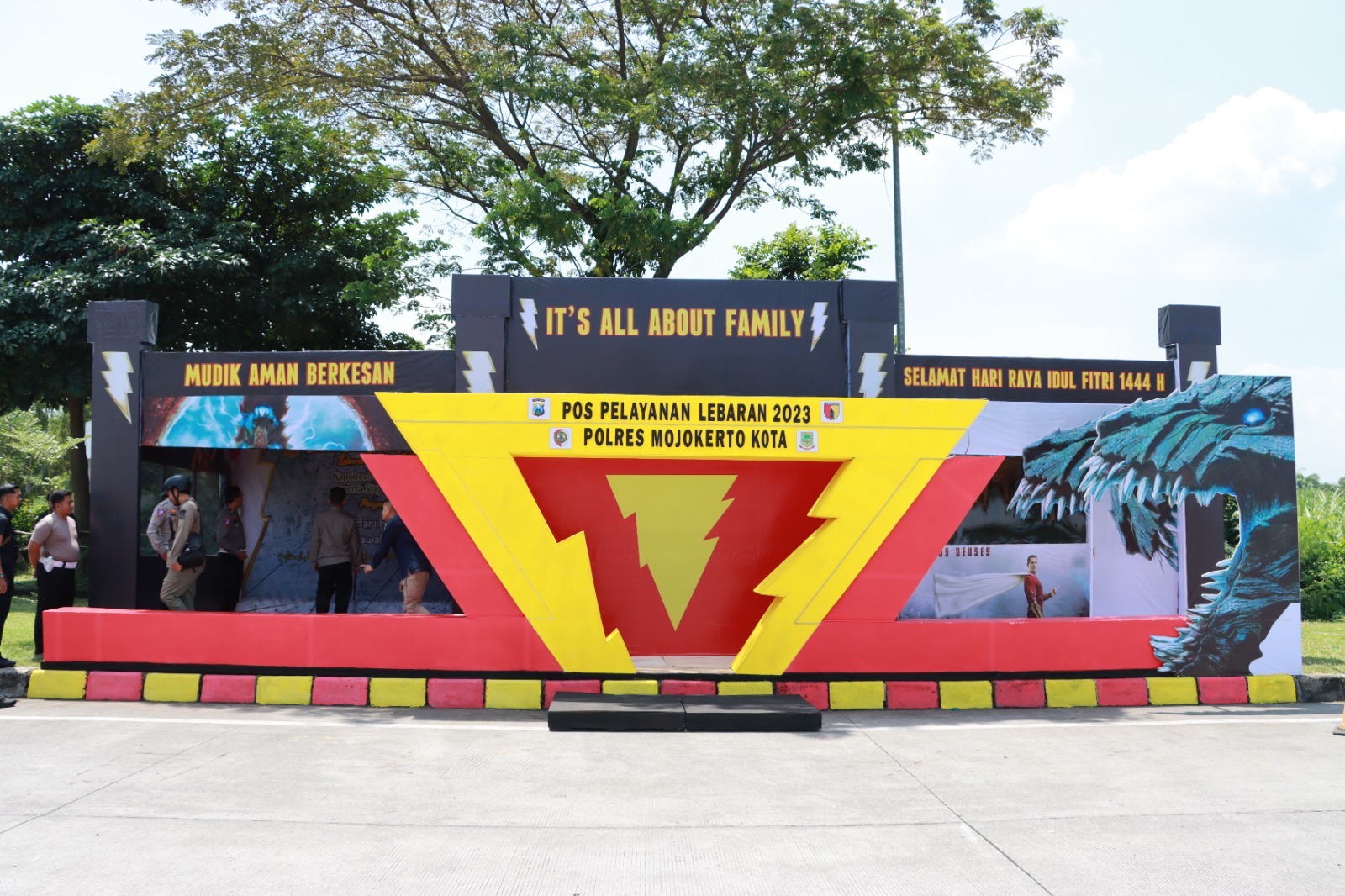 "Ya Posyan ini terinspirasi Film Shazam. Salah satu quotes-nya adalah It's All About Family. Artinya, mudik aman berkesan 2023 yang terpenting adalah ini semua tentang keluarga. Jadi, mudik tak usah buru-buru atau ngebut agar selamat sampai kampung halaman untuk bertemu keluarga," kata Kapolresta Mojokerto AKBP Wiwit Adisatria S.H, S.I.K, M.T, Kamis (20/04/23).