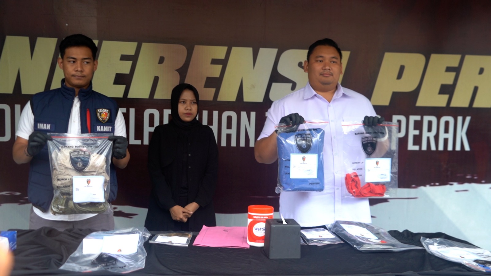 Selain mengamankan kedua tersangka, Polisi mengamankan barang bukti berupa, satu buah tas warna hitam Merk VOLTFER, satu buah HP Merk OPPO A 16 warna hitam, dan satu kaos oblong warna putih dengan motif krah warna biru yang terdapat bercak darah.