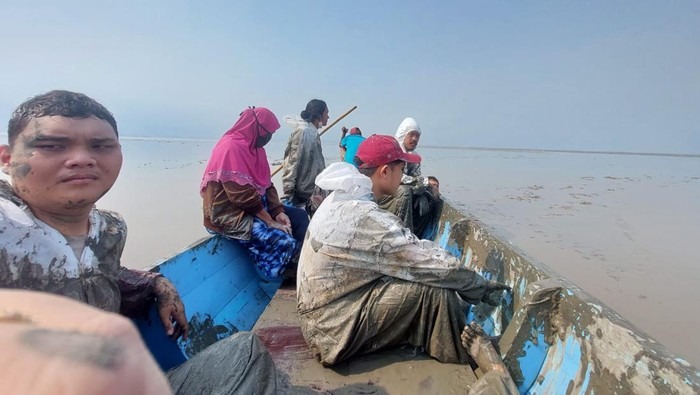 “Perahu kami terjebak lumpur karena air laut surut ada 1 jam lebih,”kata Christin.