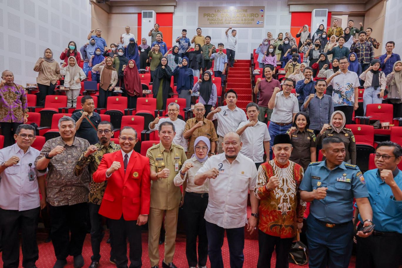 FGD menghadirkan narasumber antara lain Prof. Dr. Aminuddin Ilmar, S.H., M.H. (Dosen Fakultas Hukum Unhas), Prof. Dr. Phil. Sukri Tamma, M.Si. (Dekan Fisip Unhas) dan Dr. Fitra Arsil, SH., MH. (Dosen Fakultas Hukum UI). LaNyalla juga hadir didampingi Senator asal Sulsel, Tamsil Linrung.