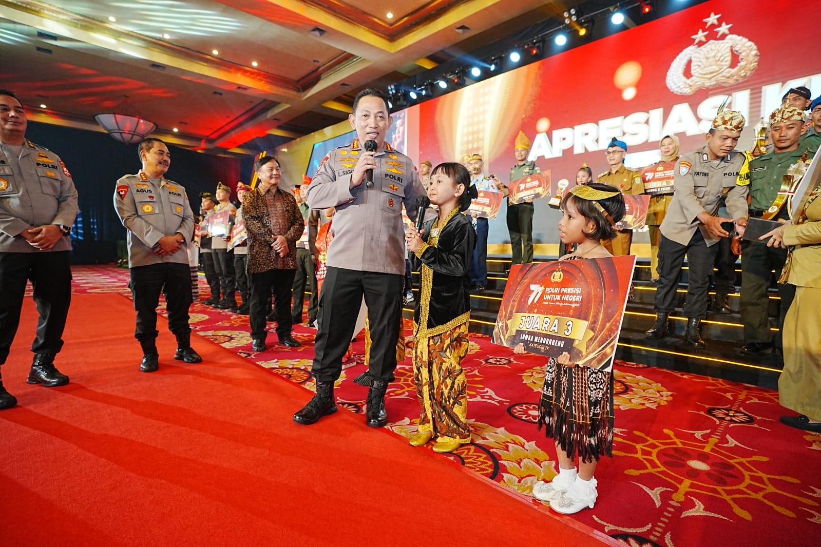 "Alhamdulillah baru saja kita melaksanakan kegiatan penganugerahan lomba kreasi terkait dengan rangkaian HUT Bhayangkara ke-77 sekaligus juga kita memberikan hadiah atau reward kepada personel-personel Polri yang berprestasi baik dalam mengharumkan nama bangsa pada saat Sea Games kemarin. Ataupun beberapa lomba internasional lainnya," kata Sigit.