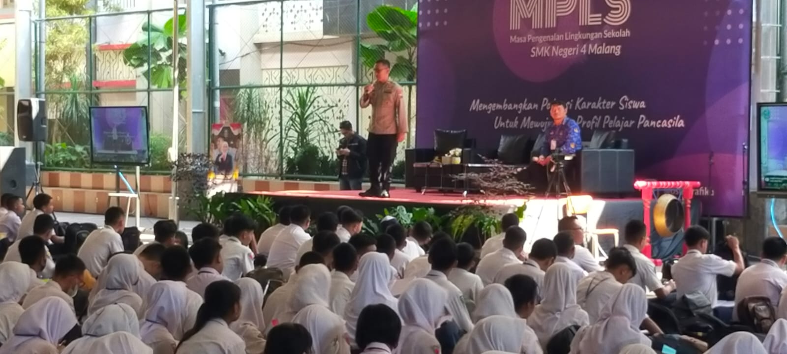 "Hari ini kami melakukan sosialisasi dan pemberian materi terkait tertib berlalulintas dan menghindari kenakalan remaja kepada para peserta didik baru di SMAKN 4 Kota Malang dan SMPN 20 Kota Malang guna membentuk mental serta karakter peserta didik yang patuh hukum" jelas Kompol Syabain, S.H. Kapolsek Klojen yang bertindak sebagai pemateri.