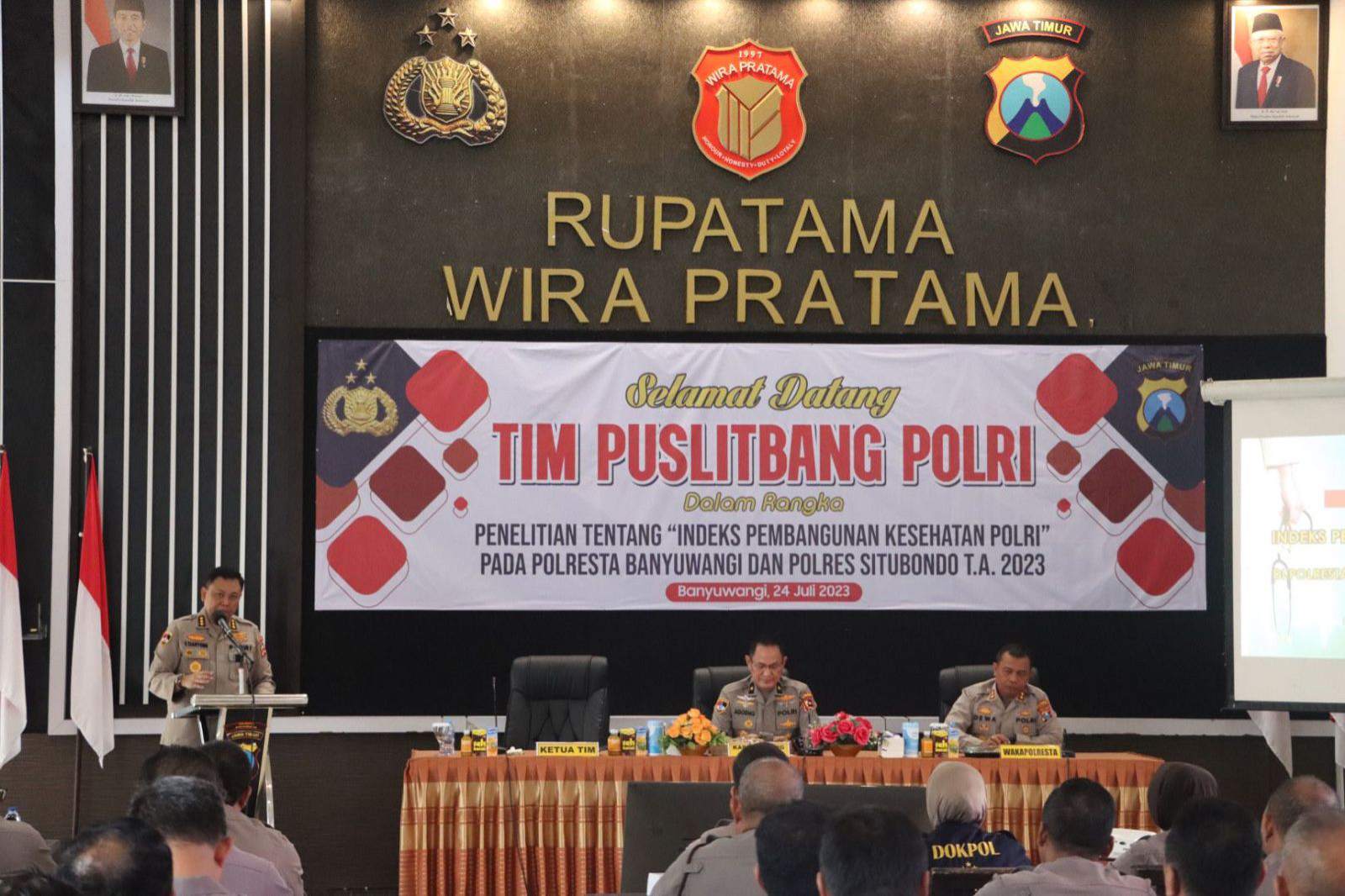 BANYUWANGI, IPERS - Dalam rangka Penelitian tentang Indek Pembangunan Kesehatan Polri pada Polresta Banyuwangi dan Polres Situbondo Tahun Anggaran 2023, dilaksanakan kegiatan Team Puslitbang di gedung Rupatama Polresta Banyuwangi, Senin (24/7).