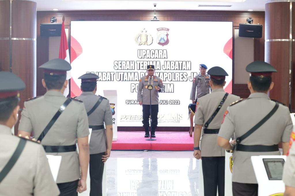 Sertijab pejabat Polda Jatim ini berlangsung di Selasar Gedung Patuh Mapolda Jatim, pada Rabu (26/7/2023).