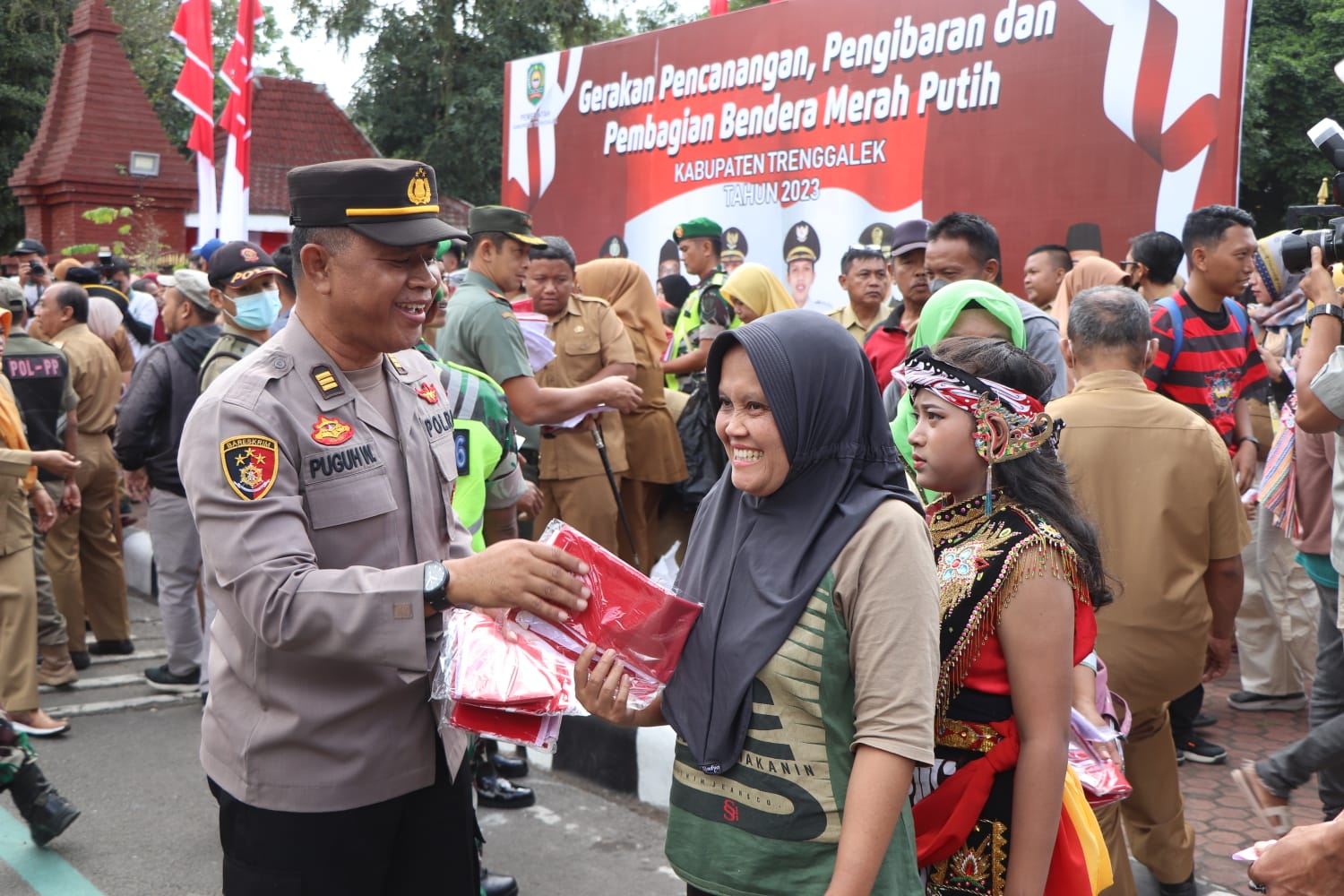 TRENGGALEK, IPERS – Jajaran Kepolisian Resor Trenggalek turut ambil bagian dalam acara Gerakan Pencanangan, Pengibaran dan Pembagian Bendera Merah Putih yang dipusatkan di Pendopo Manggala Praja Nugraha, Kabupaten Trenggalek, kemarin Senin, (31/7).