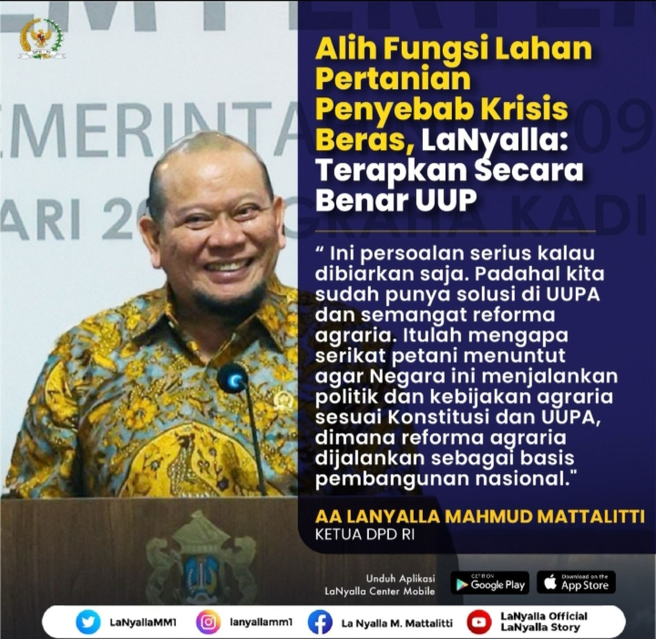 Bojonegoro || IPers - Alih fungsi lahan pertanian yang terus menerus terjadi mendapat sorotan dari Ketua DPD RI AA LaNyalla Mahmud Mattalitti. Pasalnya alih fungsi lahan pertanian masih menjadi penyebab utama penurunan produksi padi di Indonesia.