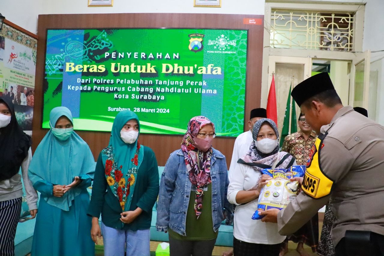 Dalam kunjungannya, Wakapolres Tanjung Perak Kompol Ari Bayuaji secara simbolis menyerahkan bantuan sosial (bansos) berupa paket sembako untuk para Dhu'afa melalui PCNU Kota Surabaya.