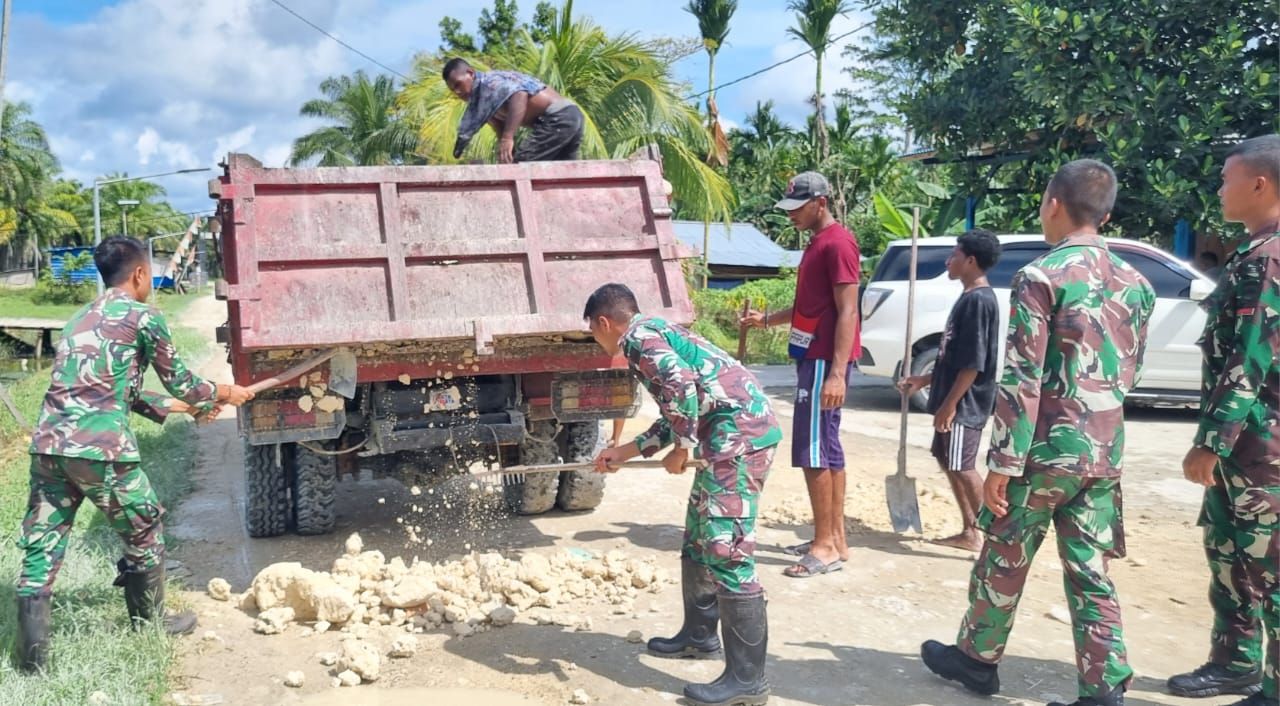Kabupaten Keerom || IPERS - Demi keamanan dan kenyamanan serta meminimalisir terjadinya kecelakaan, prajurit Satgas Pamtas RI-PNG Statis Yonif 122/TS Pos Yamara bergotong royong bersama mayarakat memperbaiki jalan yang rusak di Kampung Yanemyo, Distrik Arso Timur, Kabupaten Keerom, Rabu (01/05/2024).