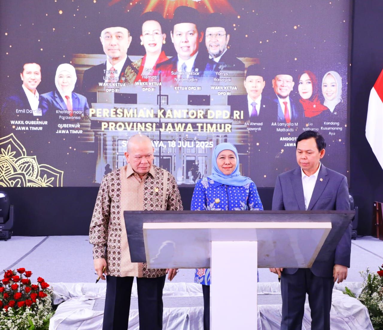 SURABAYA, IPERS  - 19 JULI 2025 - Gubernur Jawa Timur Khofifah Indar Parawansa meresmikan Kantor Dewan Perwakilan Daerah Republik Indonesia (DPD RI) Provinsi Jawa Timur yang berlokasi di Jalan Jemur Andayani I Surabaya, Jumat (18/7).